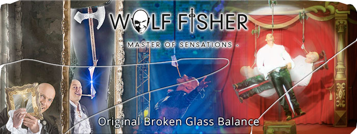 Spüren Sie die atemlose Spannung, wenn Wolf Fisher in seiner weltweit einmaligen Darbietung die Scherben eines vor Augen des Publikums zerschlagenen Spiegels aufeinander balanciert - und dabei wie ein Uhrzeiger um 360° herumgedreht wird!