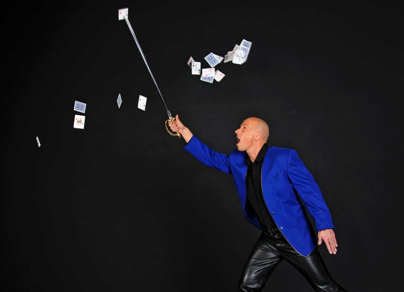 - eine gewählte Karte aus vielen in der Luft mit einem Degen heraussticht,